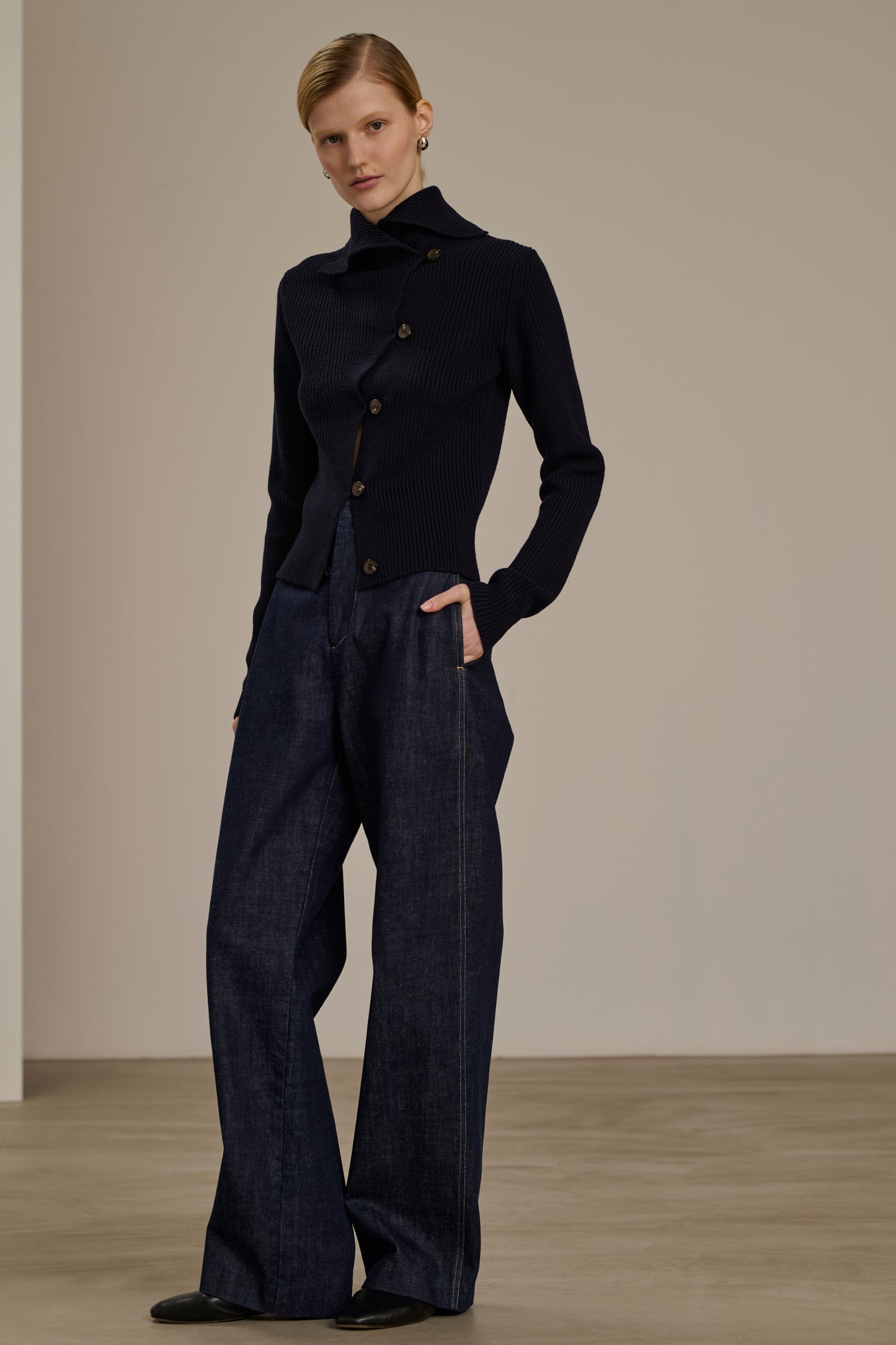 WIMY is a fitted ribbed knit cardigan. Numerous buttons allow for an adjustable collar, to be worn high or open. It can be worn directly on the skin as a cardigan or layered as a lightweight jacket. It is part of our monogram "S" embroidered line. This version is made from fine and warm merino wool.