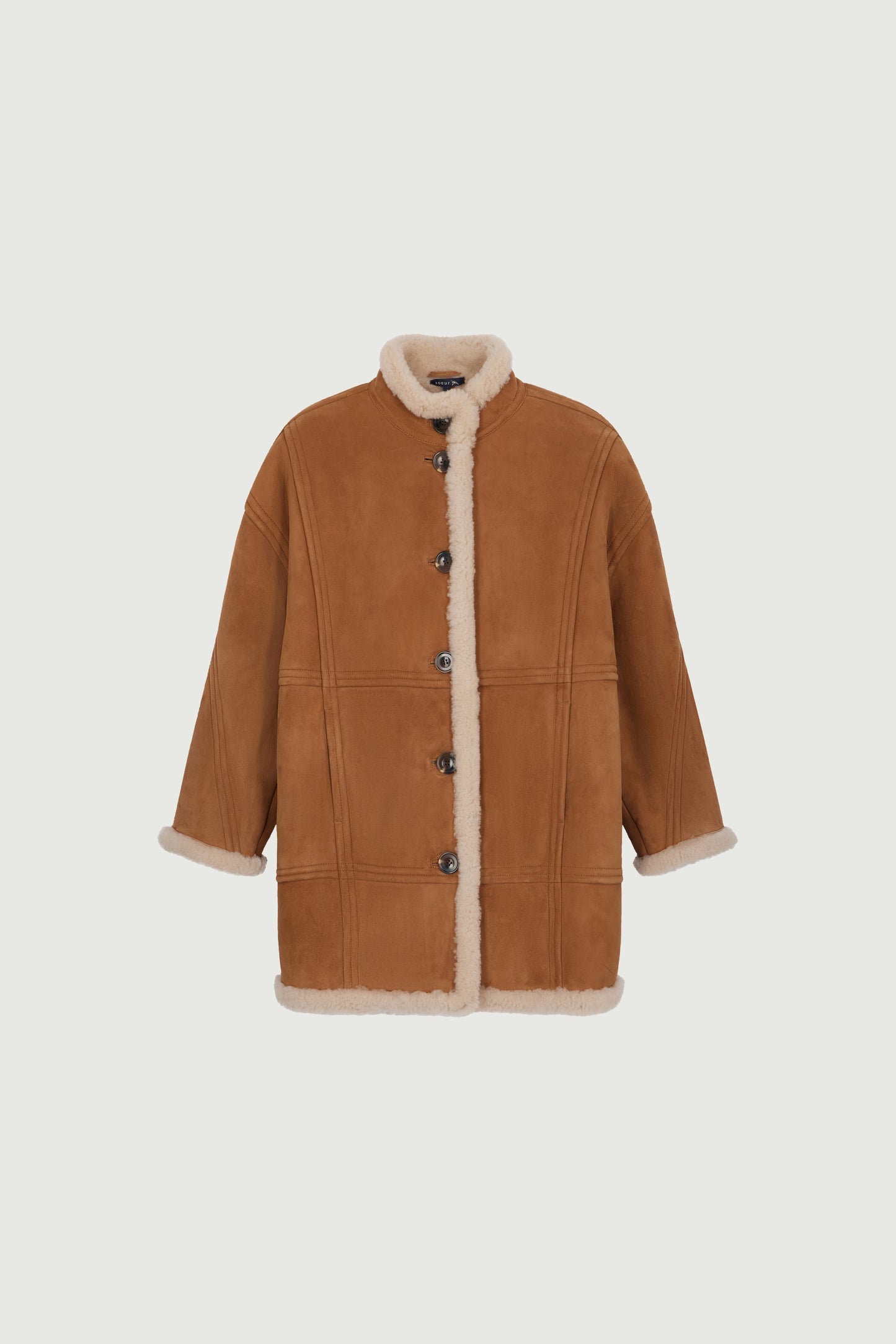 VERBIER is a sheepskin coat. Large yokes emphasised by topstitching add texture to this classic and timeless coat. The concealed front pockets add to its oversized and casual look.
