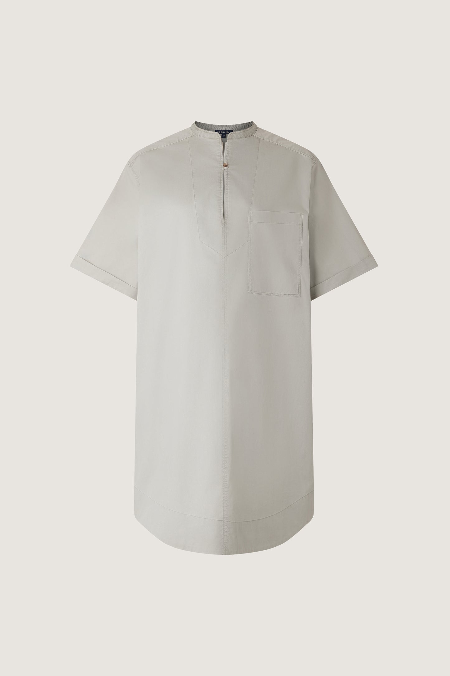 ALICE is a short-sleeved dress made from a soft and lightweight fabric, perfect for transitioning between the spring and summer seasons. Its generous collar forms a point that can be buttoned up for a more closed neckline. The cotton gabardine provides a luminous and silky feel, almost like satin.