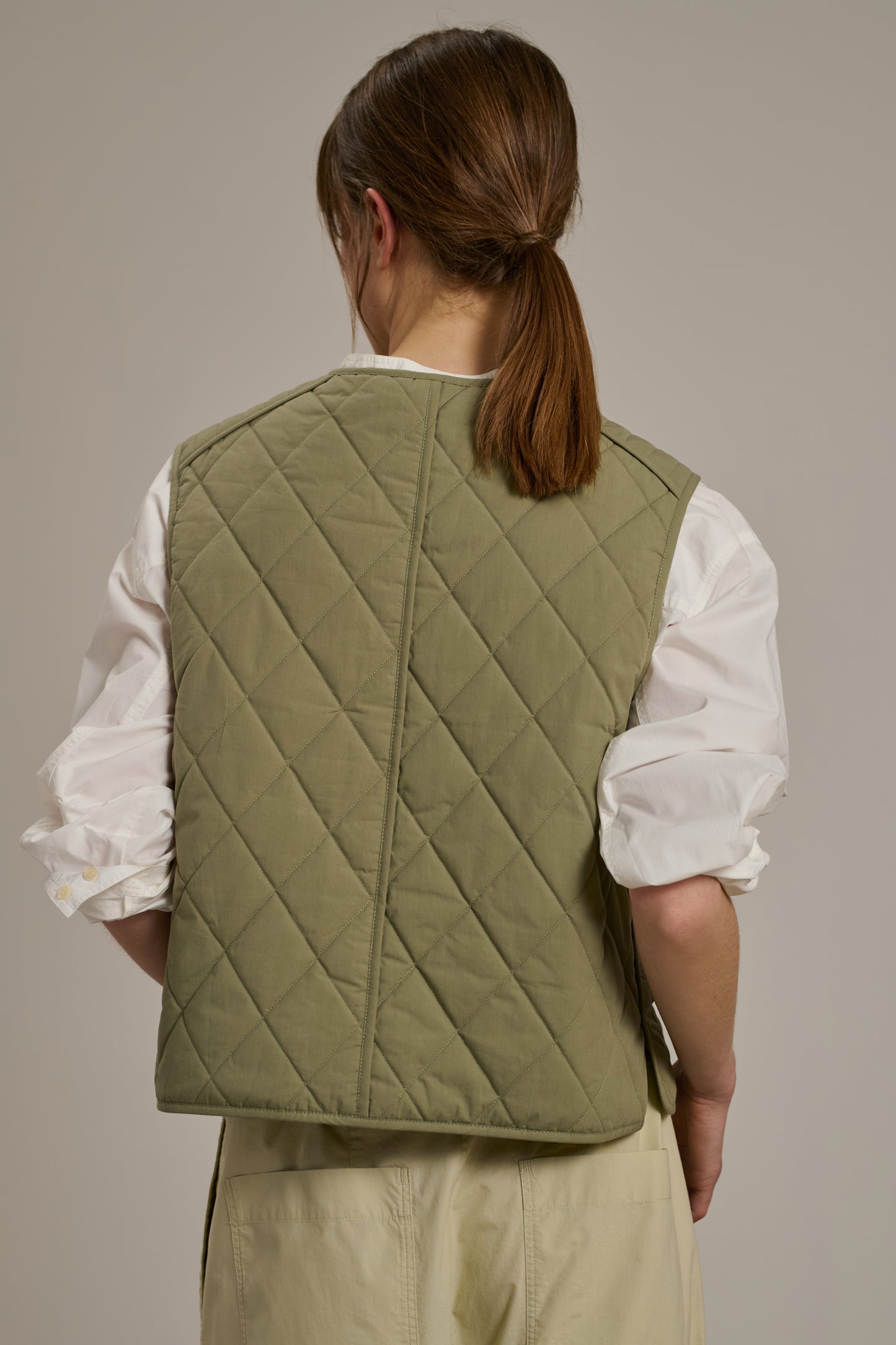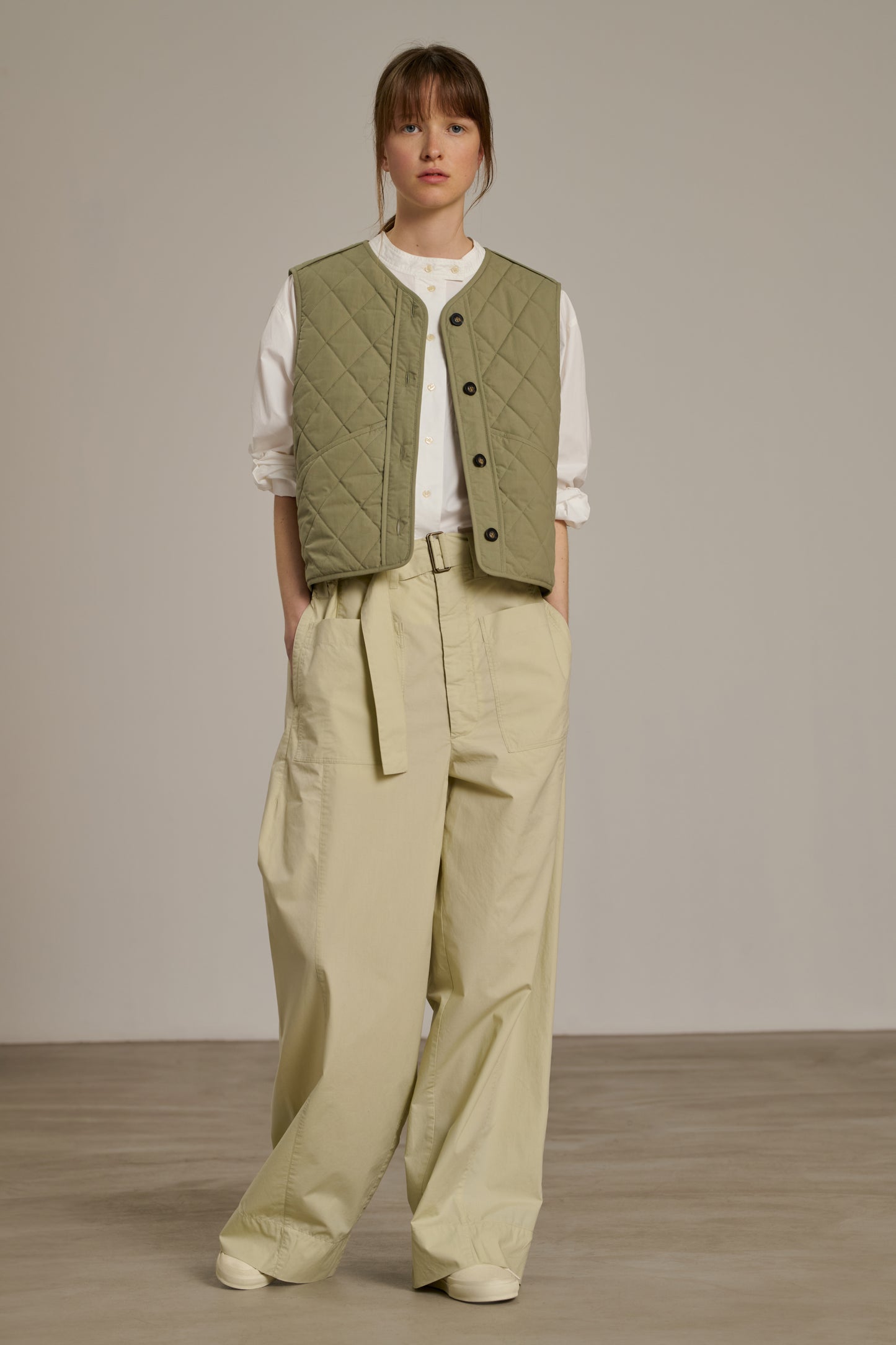 ULLA est un gilet matelassé en coton que l'on peut superposer à volonté. Il est légèrement rembourré mais suffisamment fin pour être porté sous un manteau sans contraindre le mouvement. Les finitions gansées soulignent les épaules, les poches plaquées, et la patte de boutonnage.
