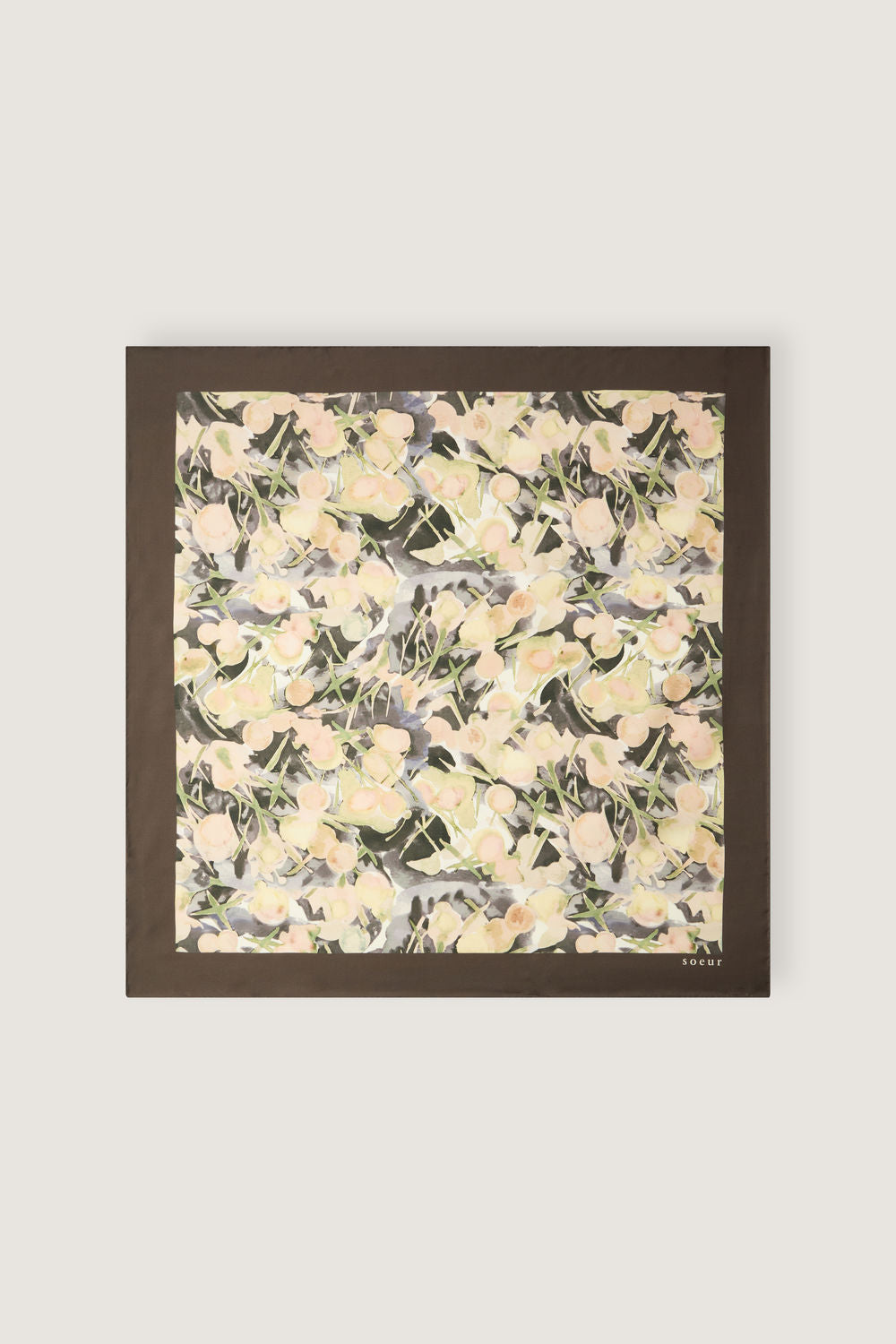 CAPUCINE est un foulard en soie imprimée. Signature du vestiaire Soeur, nos carrés en soie apportent une touche d'élégance et de fantaisie à n'importe quelle tenue : noués autour du cou, dépassant discrètement d’un col de chemise ou de pull, noué sur l'anse d’un sac, ou en fichu sur la tête…