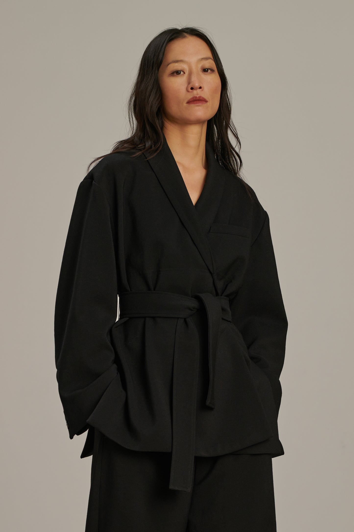 COME est une veste en grain de poudre léger d'un genre nouveau. À la coupe type "peignoir" décontracté, elle est sublimée par l'usage d'un tissu élégant.